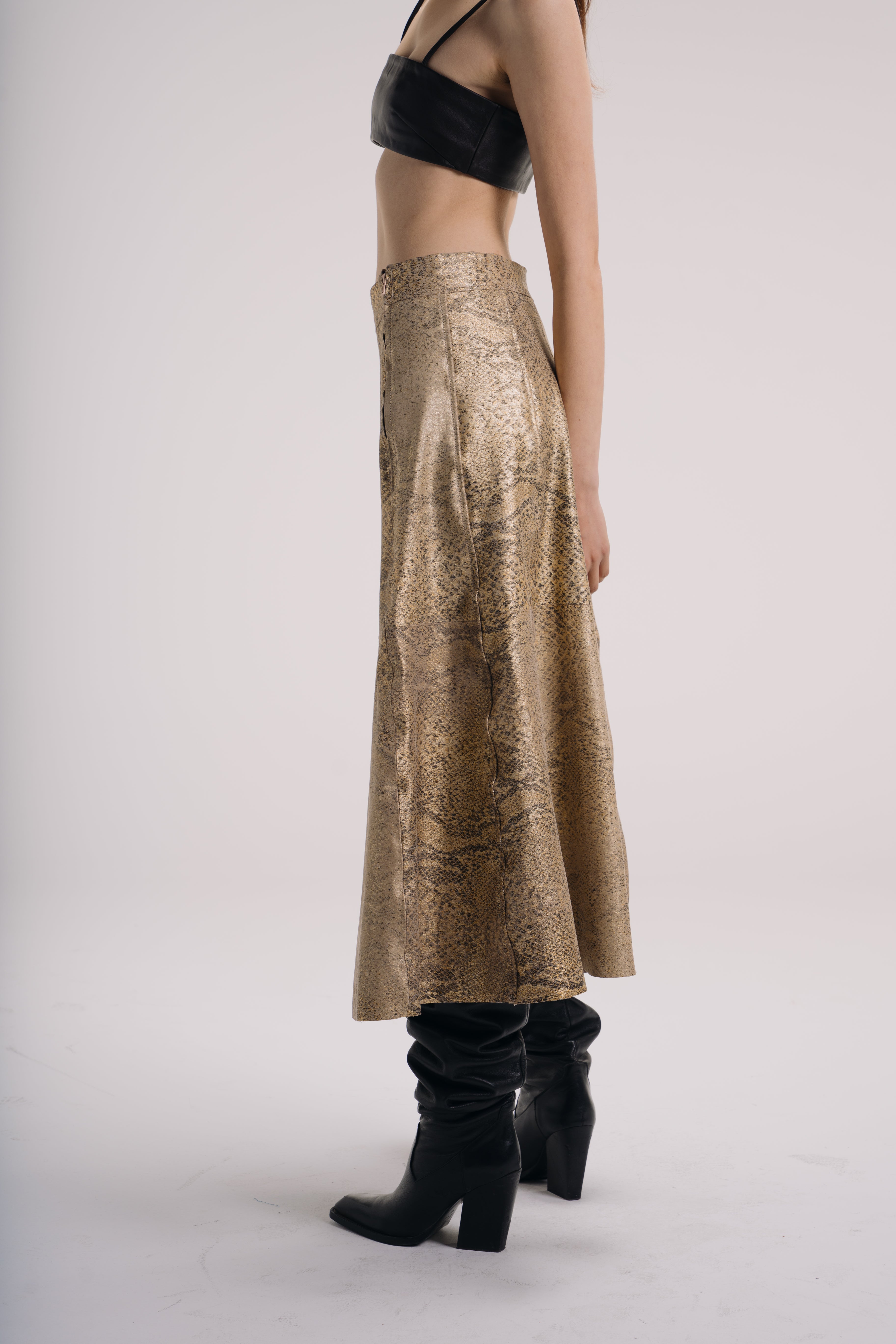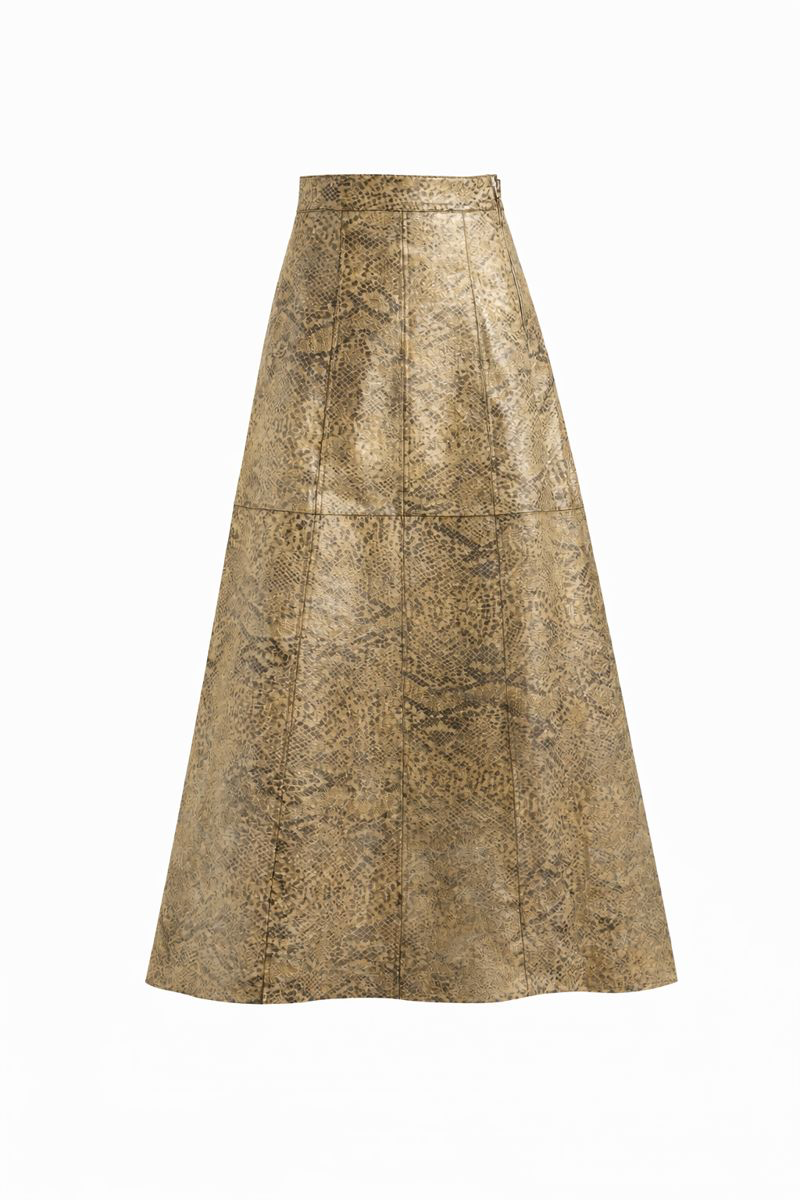 Constructed from multiple vertical leather panels with a horizontal seam at mid-length.
