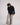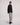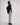 Details include a crystal-effect front button, concealed zip, two front pockets, and a raw-cut hem for a subtle deconstructed finish. Designed for a strong silhouette with clean lines and sharp contrast.