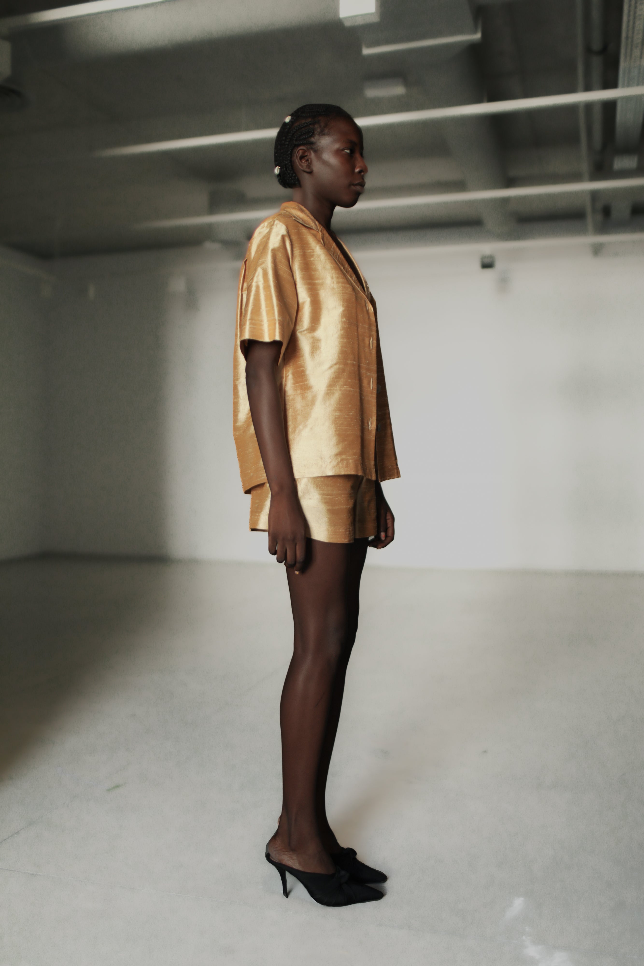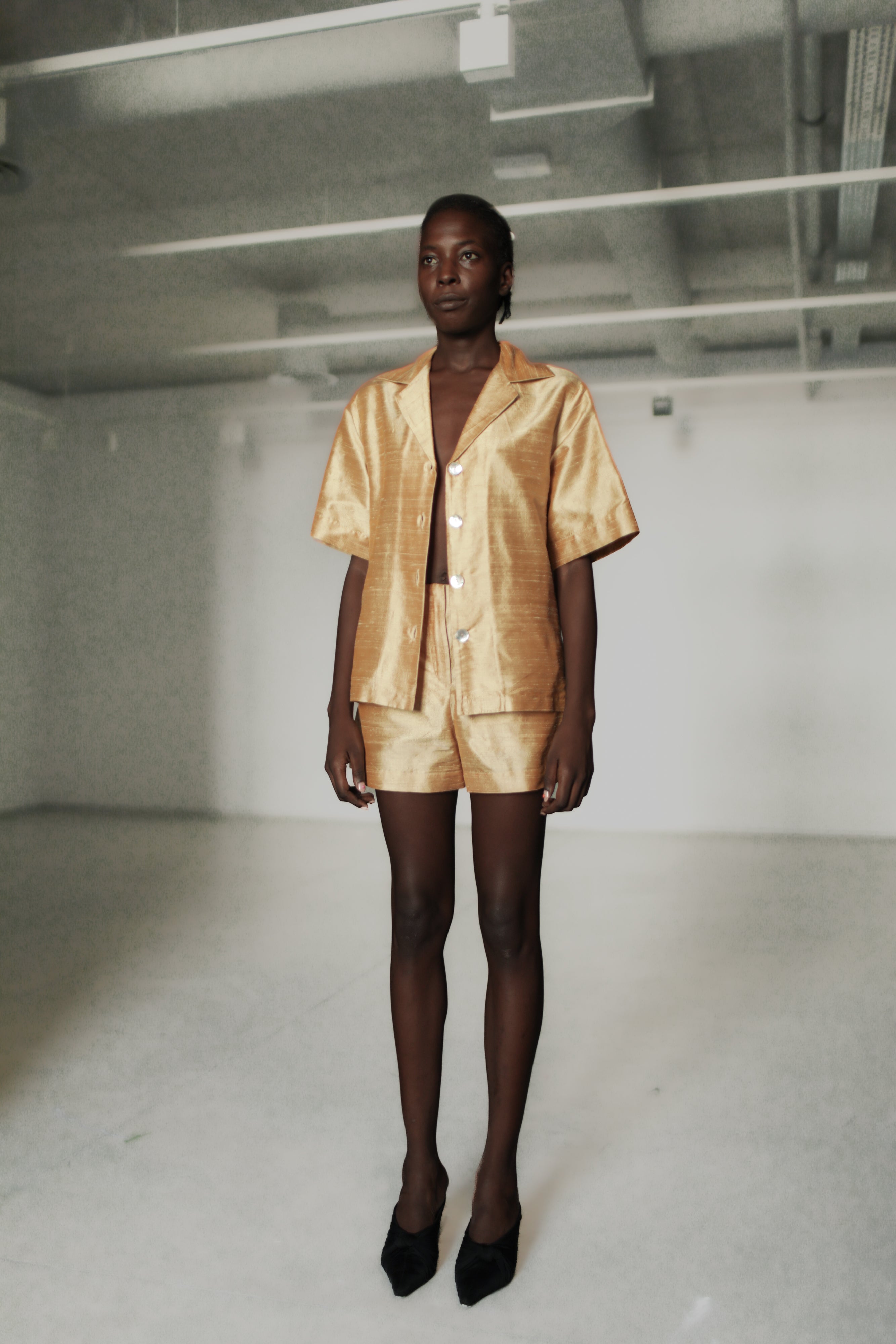 Get to know our Sandra Shirt, a relaxed-fit garment crafted from shantung silk fabric, presented here in Golden Sand.