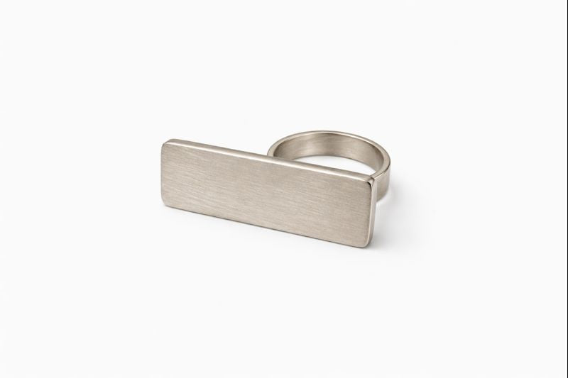 The design features a flat rectangular silver plate mounted vertically on a simple circular band.