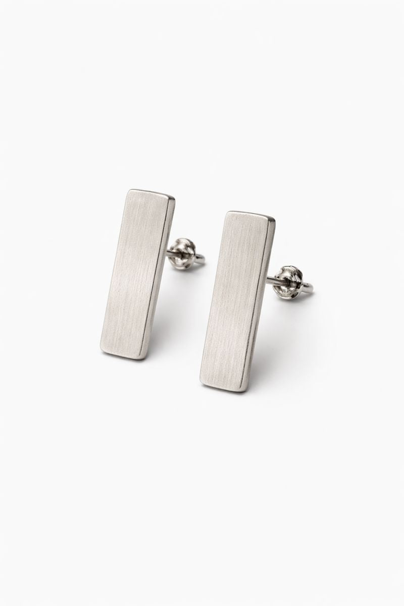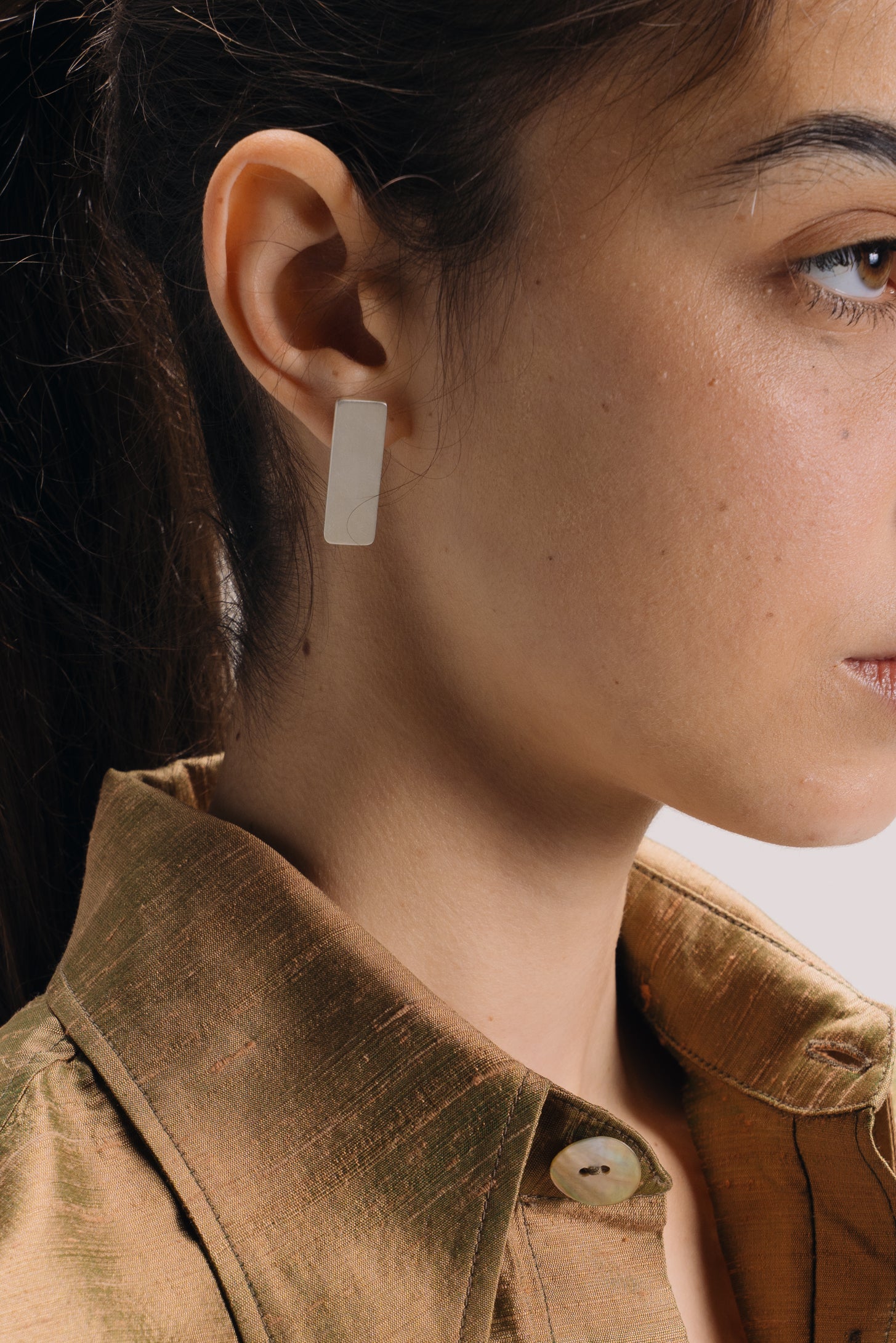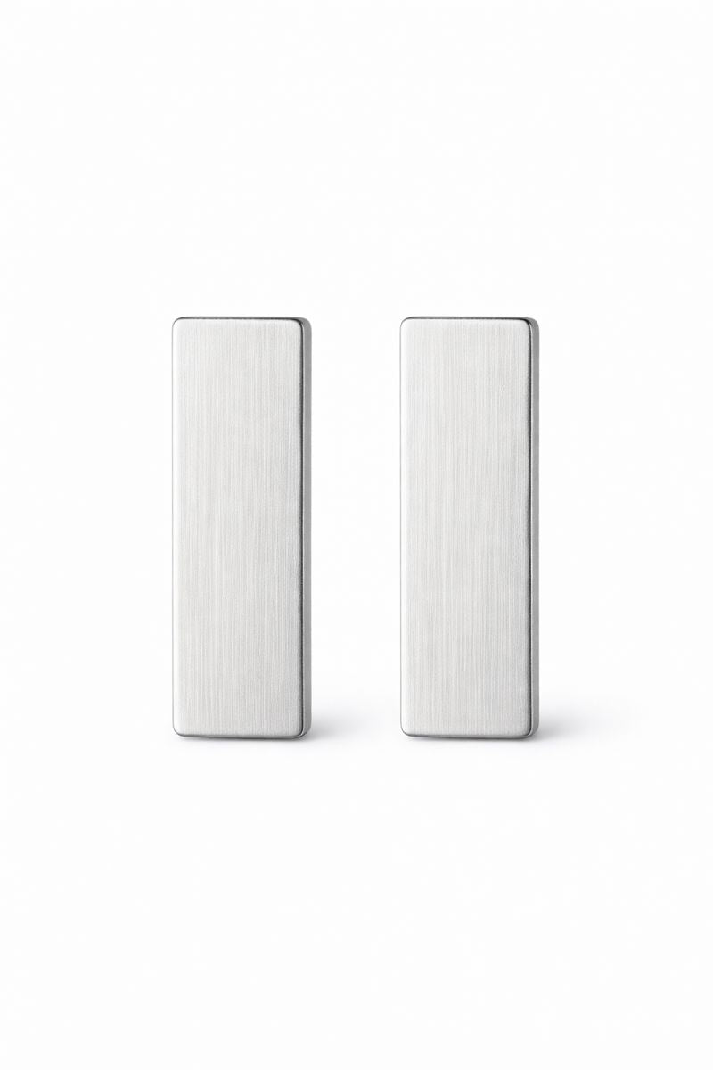 Each earring is composed of a flat rectangular silver element with softly rounded edges.