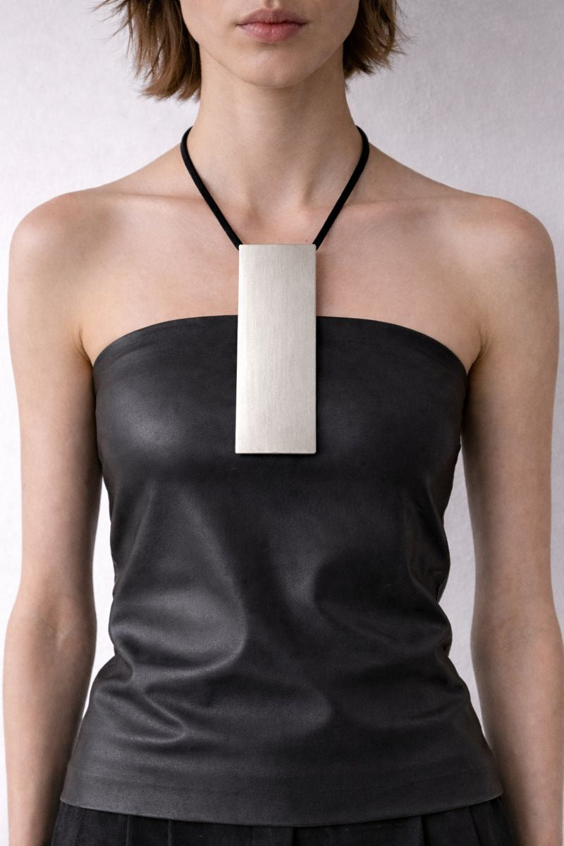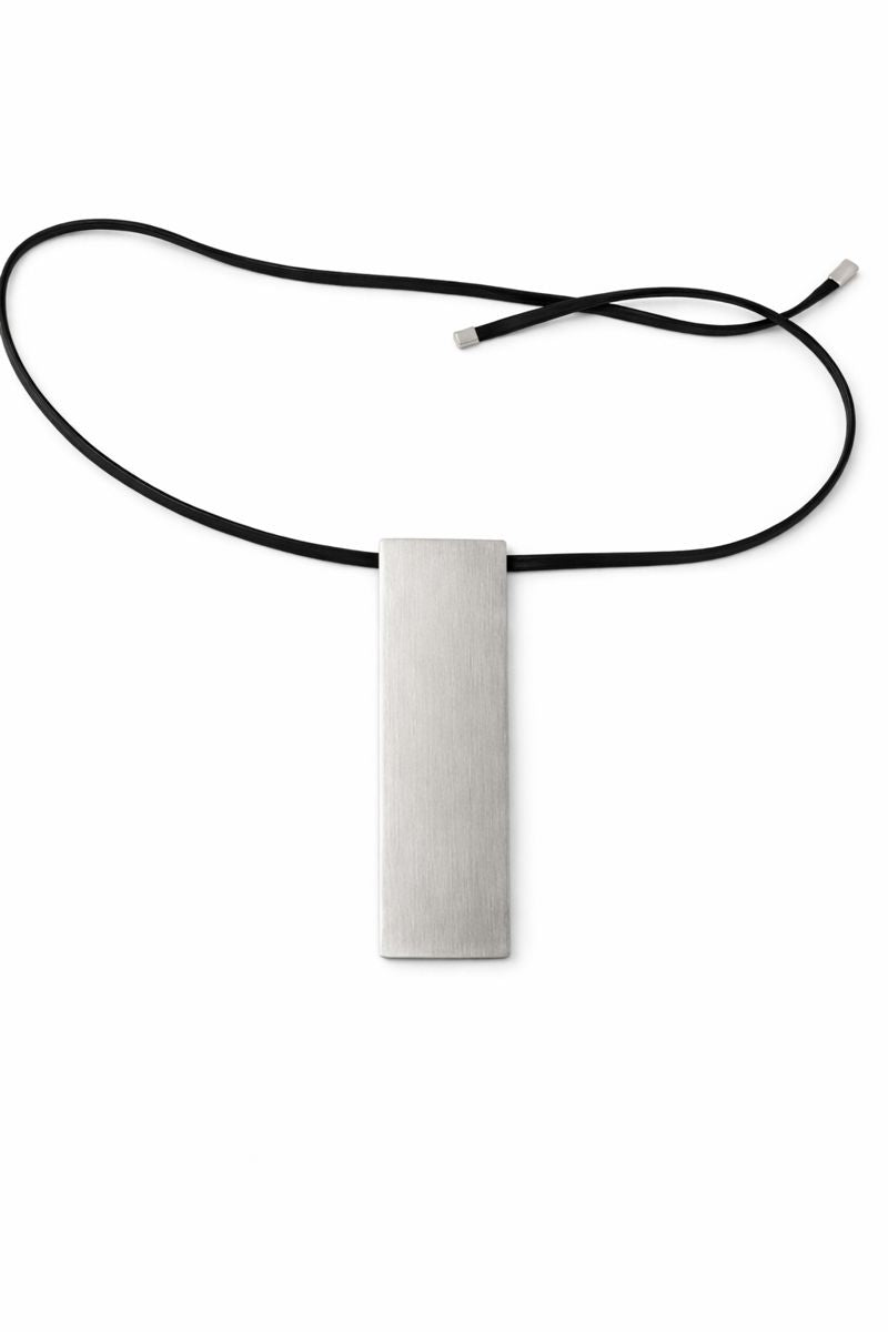 Necklace composed of a flat rectangular sterling silver pendant with a brushed finish.