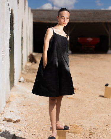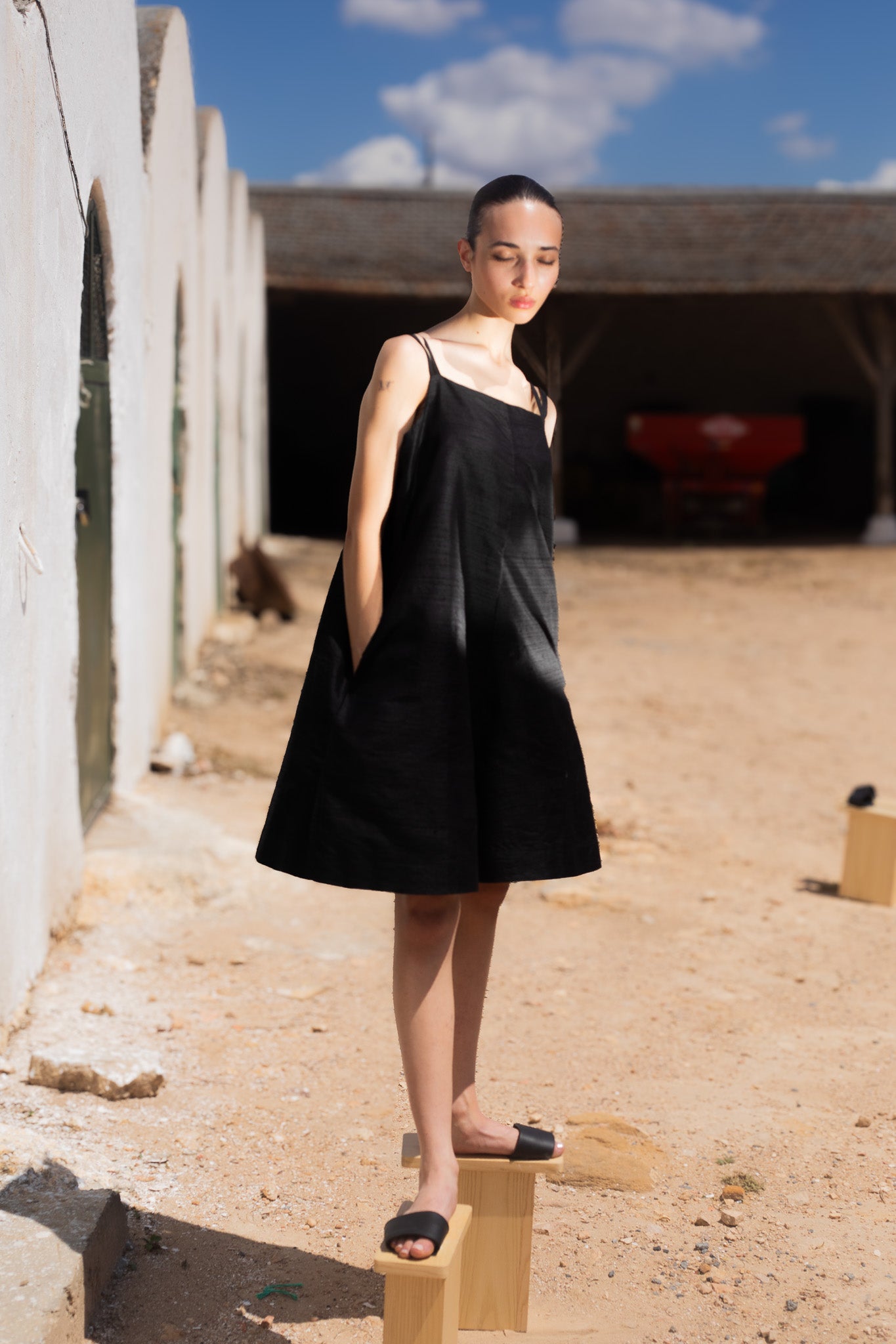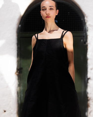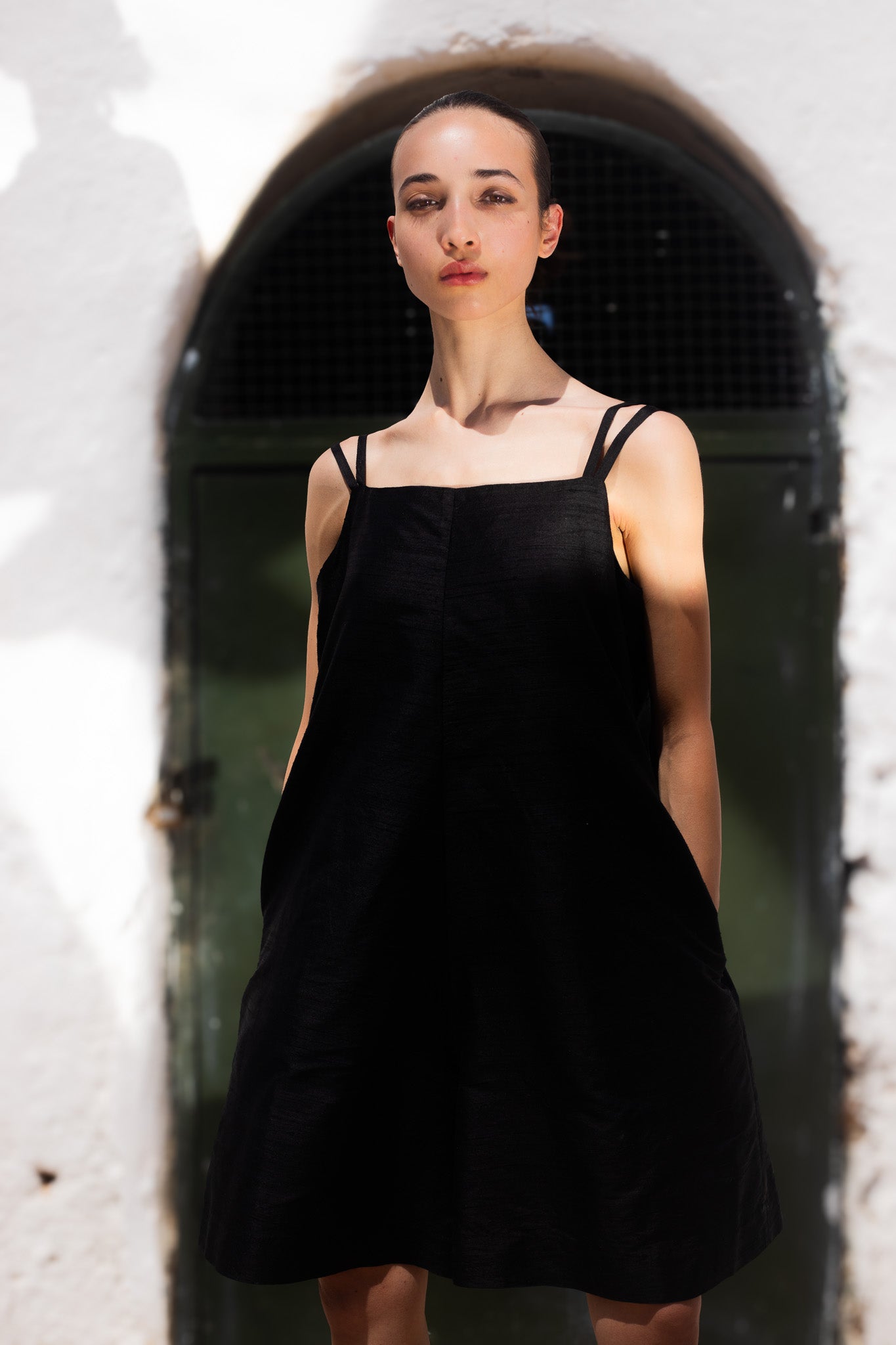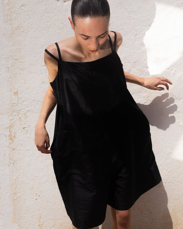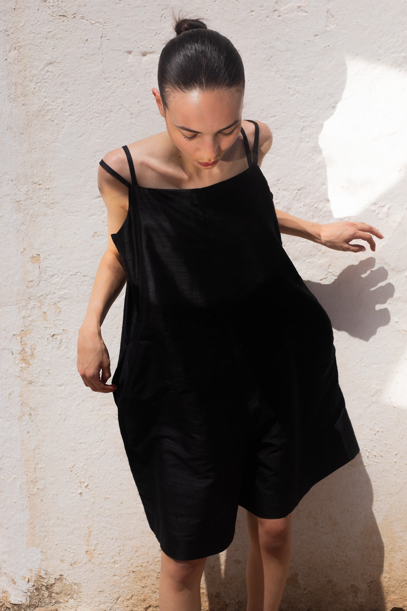 The Olfa is a loose-fitting combishort designed in 100% shantung silk, cut to fall just above the knees with a distinctly boyish, Bermuda-style bottom. The silhouette is fully oversized yet sharply constructed, giving the piece a clean, geometric volume. The top features a square neckline and thin adjustable straps, keeping the upper body minimal while the lower half brings structure and ease.